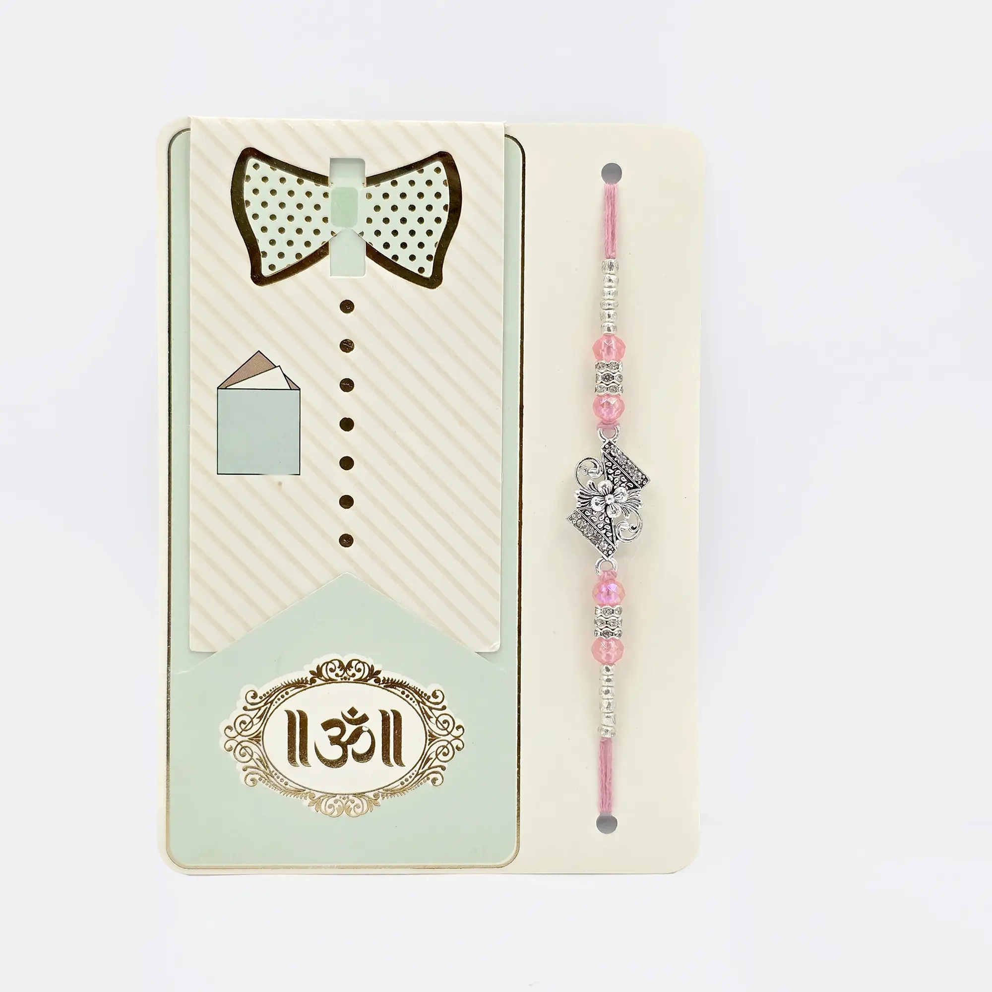 Celebrate the bond of love with this exquisite Rakhi. This stunning Rakhi features a delicate design with pink beads and shimmering silver accents.  A central, intricately designed silver flower-like charm adorned with sparkling crystals adds a touch of elegance and makes this Rakhi truly special. It is secured with a soft pink thread for comfortable wearing. This Rakhi is perfect for expressing your affection and best wishes to your beloved brother this Raksha Bandhan.