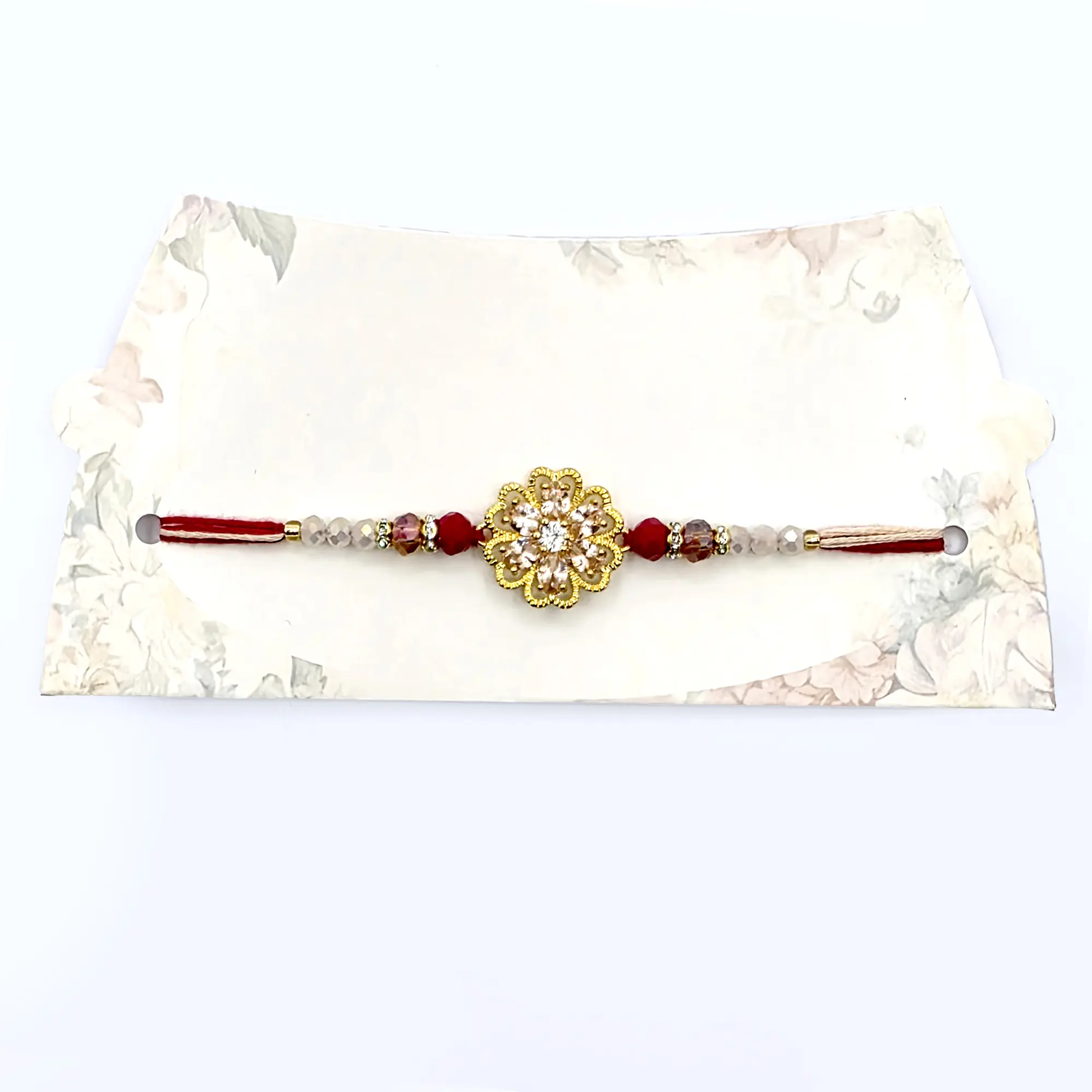 Celebrate the sacred bond of brother and sister with this exquisite Rakhi. This beautiful Rakhi features a stunning gold-toned floral centerpiece adorned with a dazzling crystal in the center. Delicate peach and ruby colored beads are interspersed along the band, adding a touch of sophistication and charm. This Rakhi is perfect for expressing your love and affection on the auspicious occasion of Raksha Bandhan.