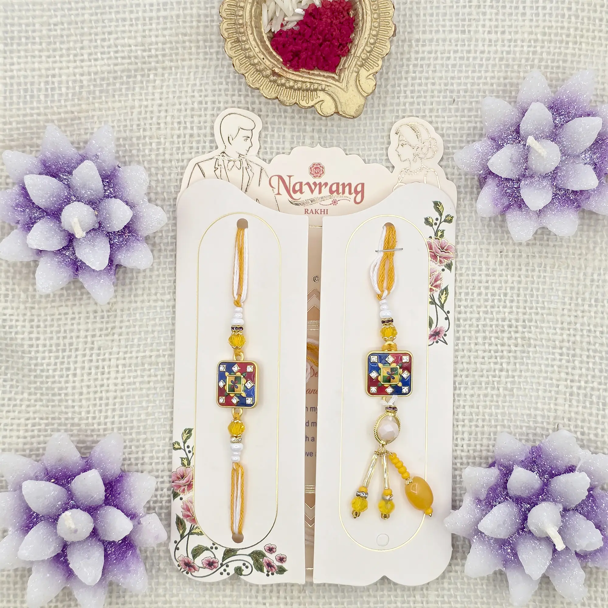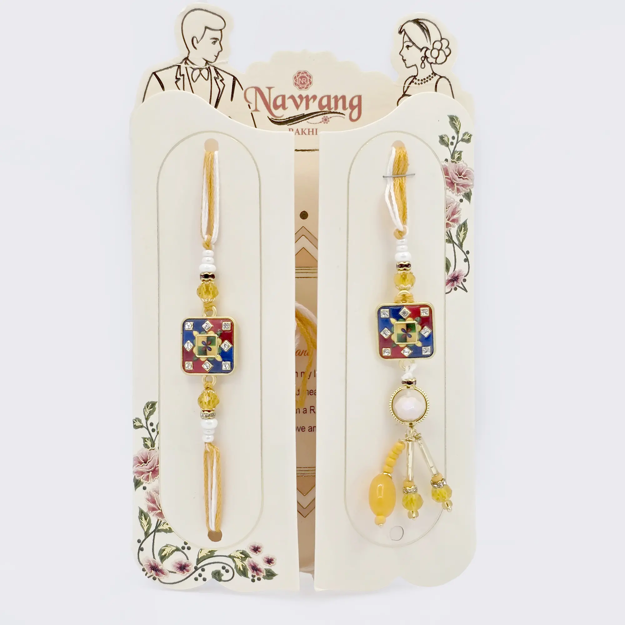Celebrate the sacred bond of Raksha Bandhan with this beautifully crafted Rakhi set. This set includes two Rakhis, each featuring a stunning square pendant with intricate enamel work in vibrant colors like red, blue, and green, accented with sparkling embellishments.