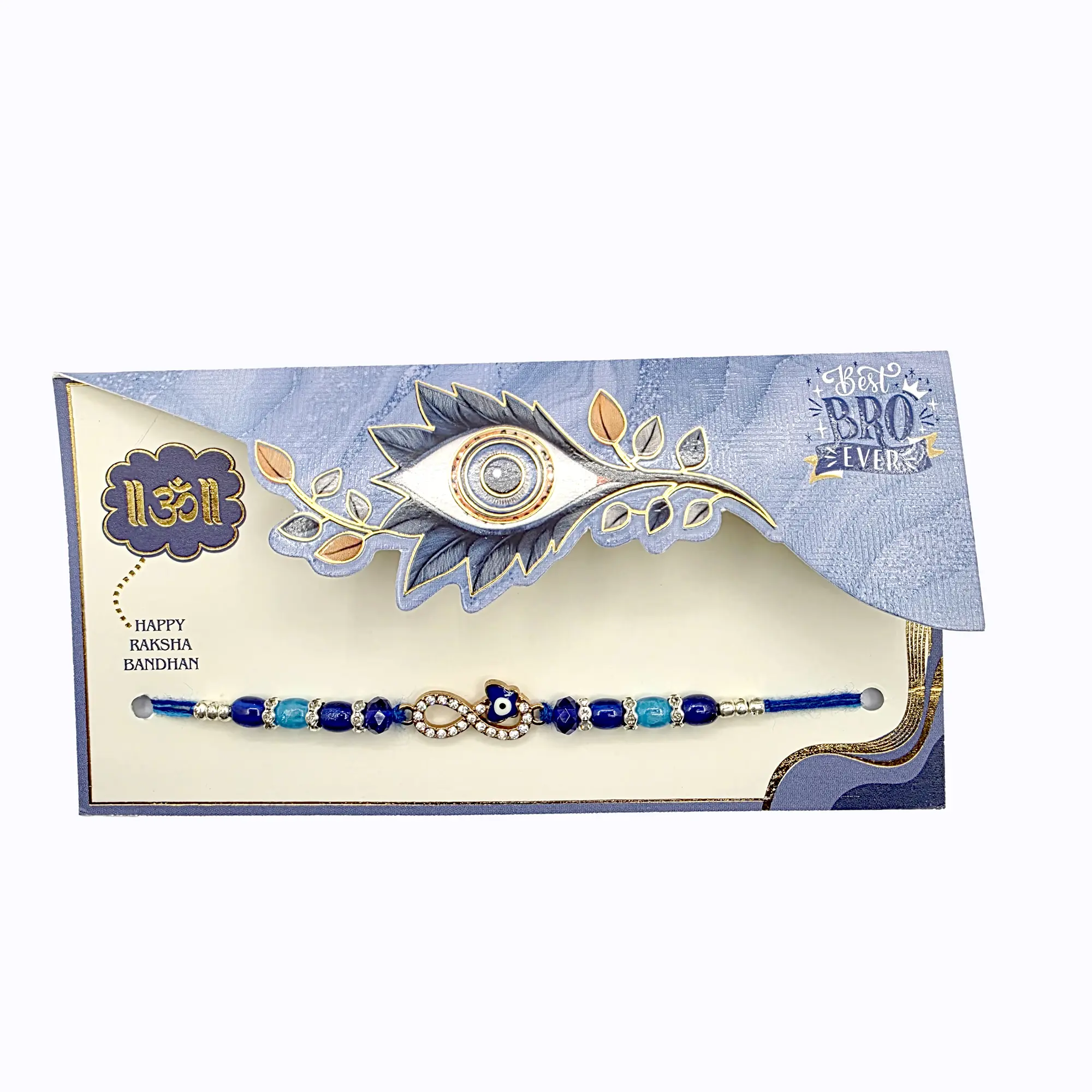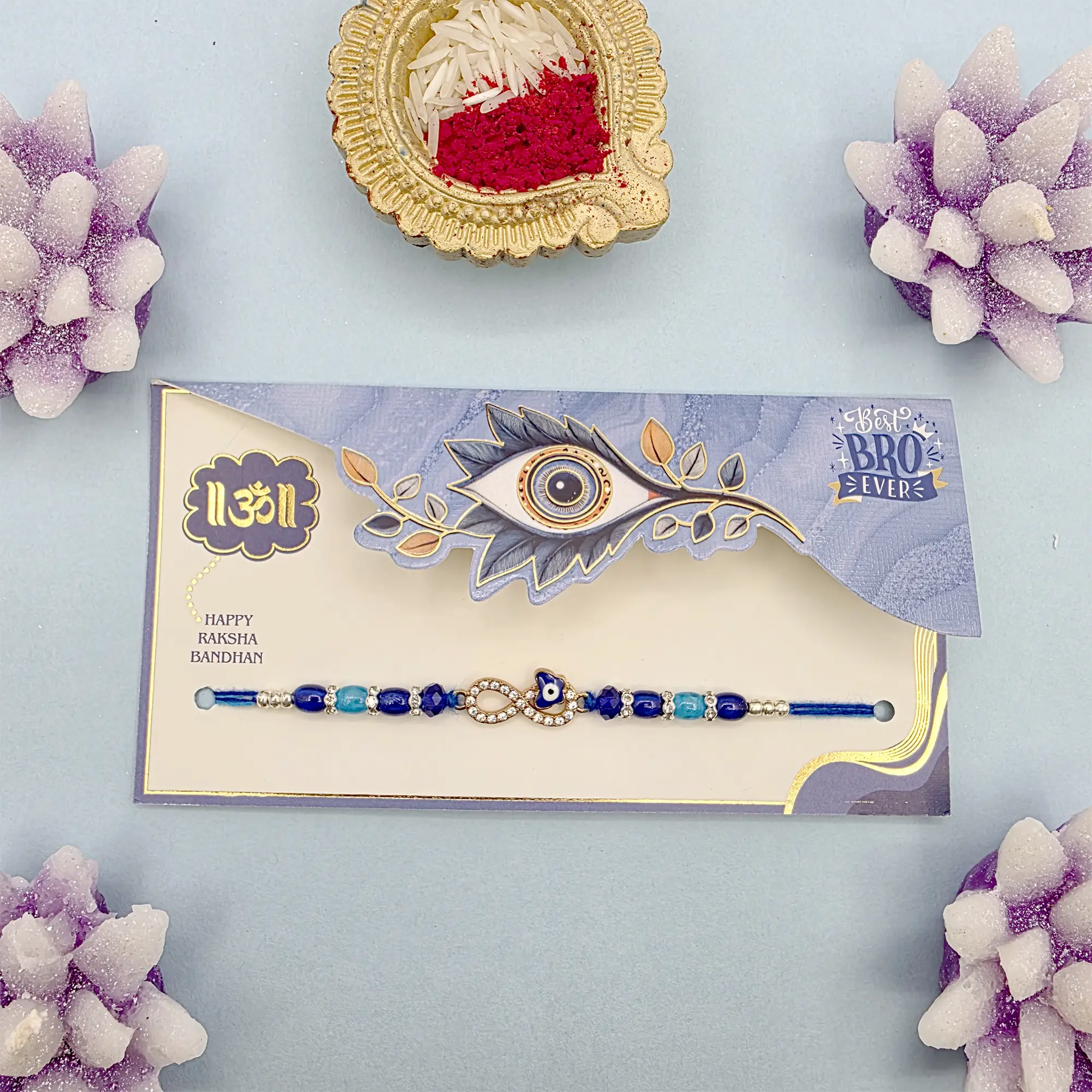 Celebrate Raksha Bandhan with this stylish and meaningful Evil Eye Rakhi. This beautifully crafted Rakhi features a delicate blue cord adorned with a string of blue and aqua beads, leading to a central charm featuring an infinity symbol encrusted with sparkling clear stones. An evil eye charm hangs from one side of the infinity symbol, symbolizing protection from negativity and bestowing good luck. This Rakhi blends traditional sentiment with contemporary design, making it a perfect token of love and care for your beloved brother.