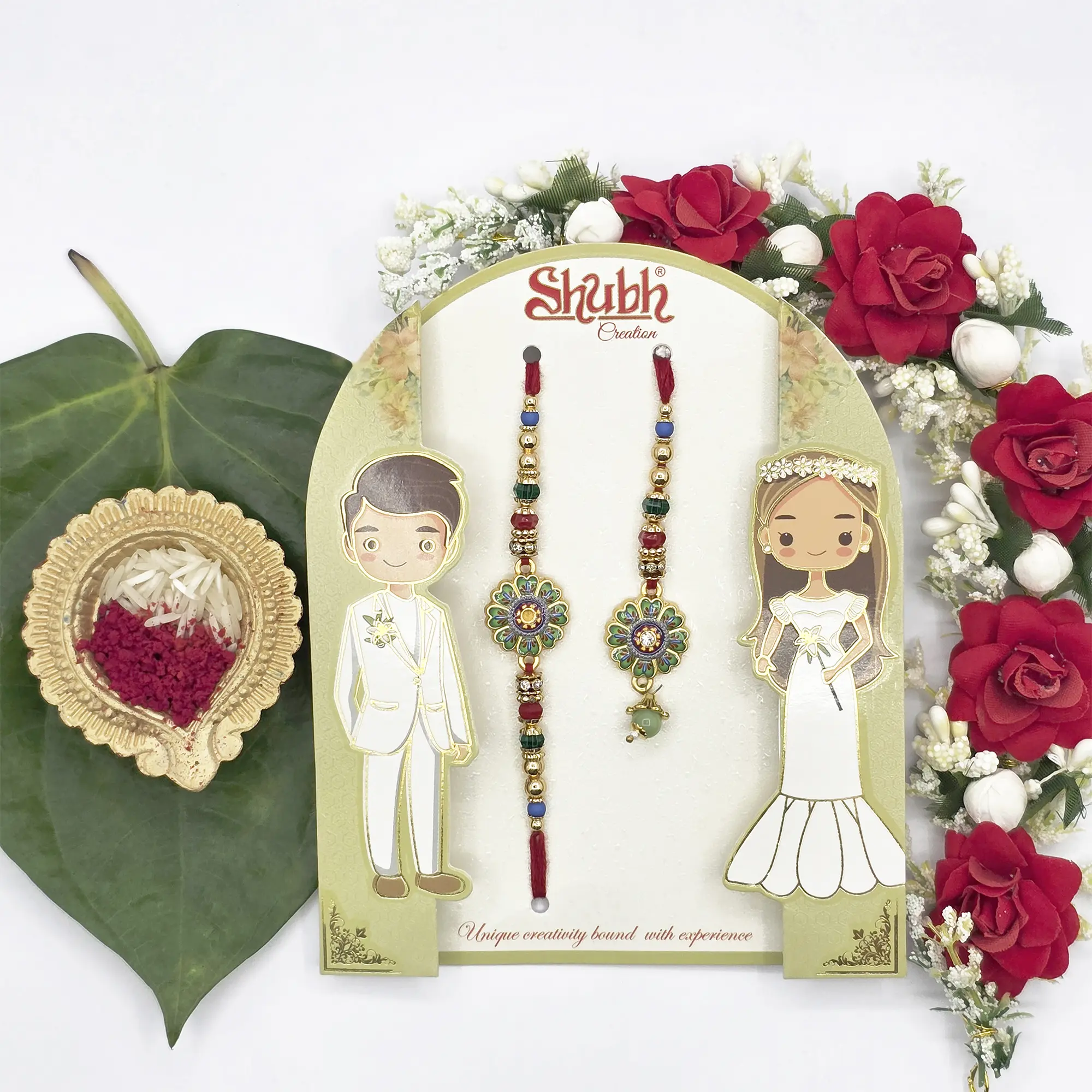 Design : Features intricate bride and groom characters with two Rakhi.