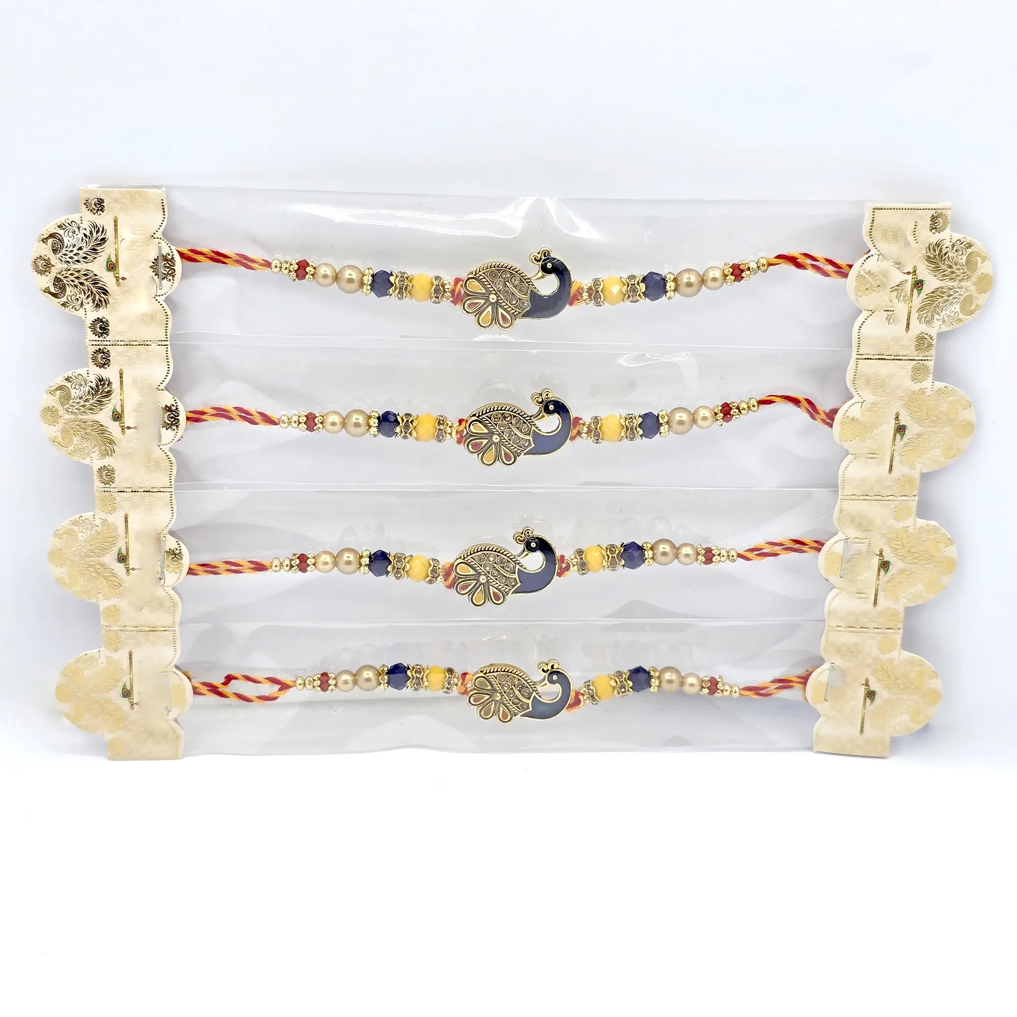 Celebrate the sacred bond of Raksha Bandhan with this stunning set of four Peacock Rakhis. Each rakhi features a beautifully crafted peacock centerpiece, adorned with intricate details and sparkling accents. The vibrant colors and shimmering beads create a captivating design that will surely delight your beloved brother.