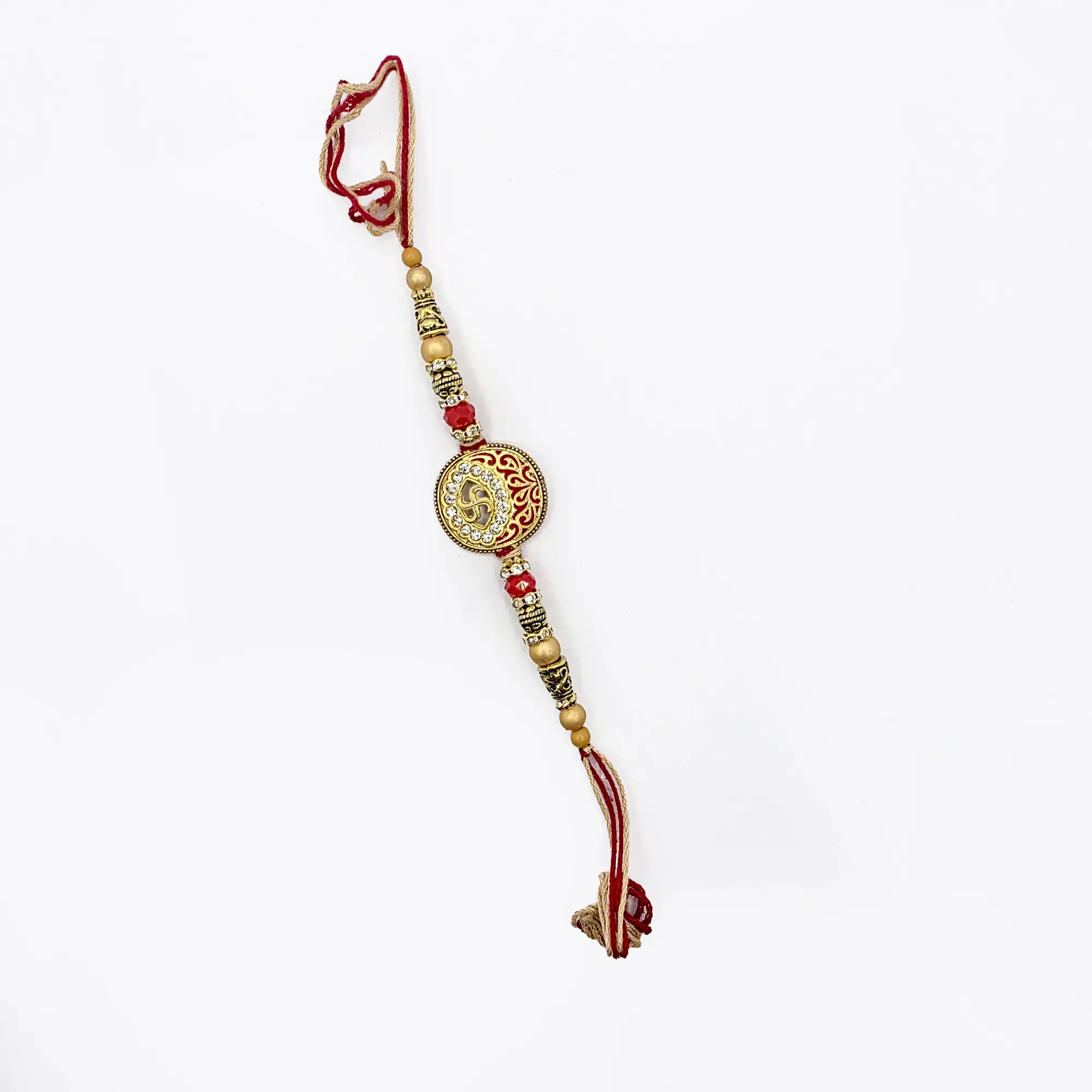 The Rakhi is adorned with intricate golden beads, decorative spacers, and vibrant red accents, connected by a durable and comfortable red and gold braided thread. This exquisite Rakhi is sure to make your brother feel loved and cherished on this special occasion.
