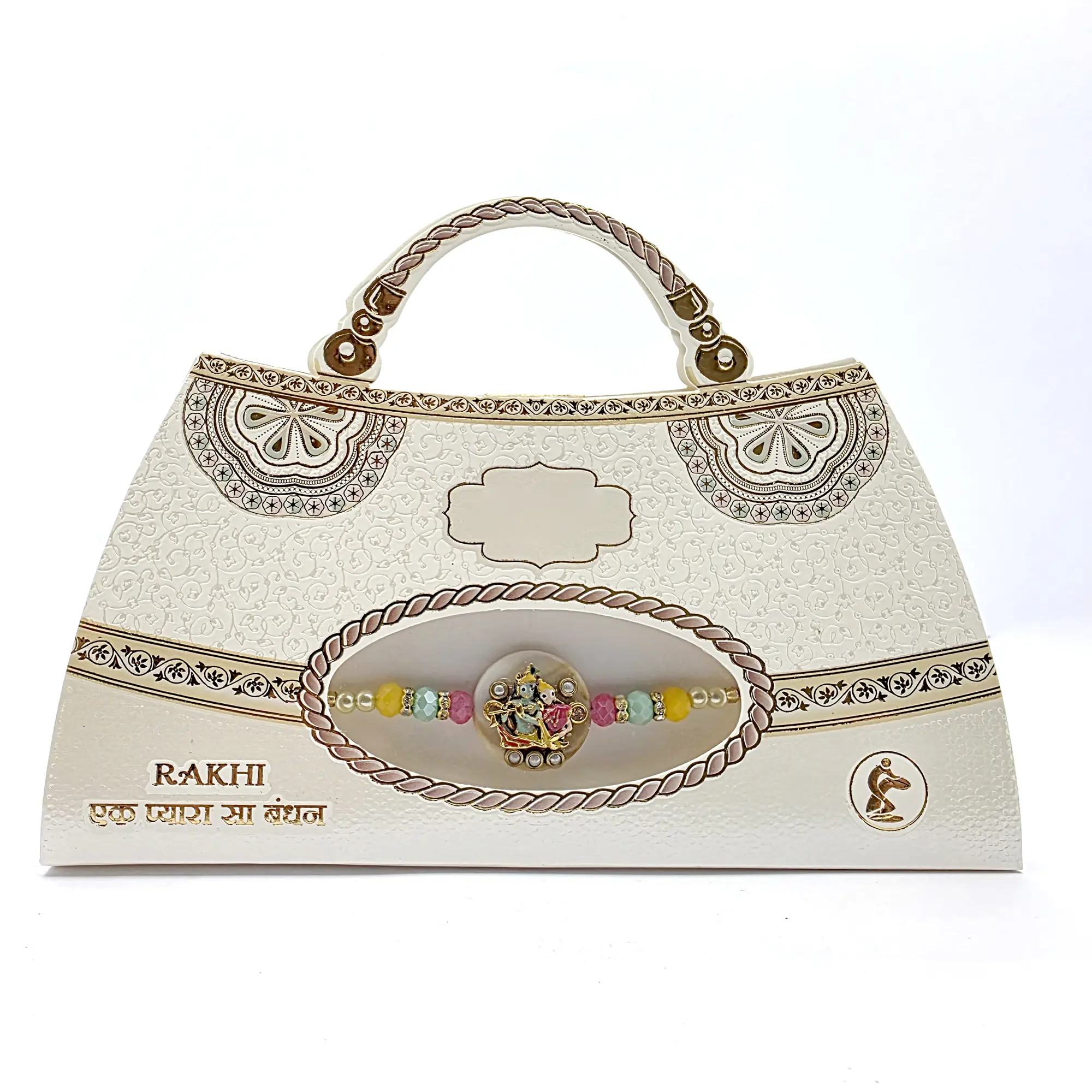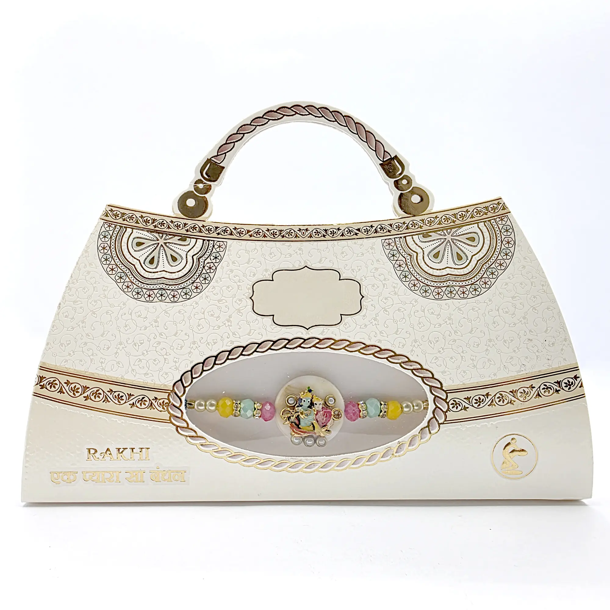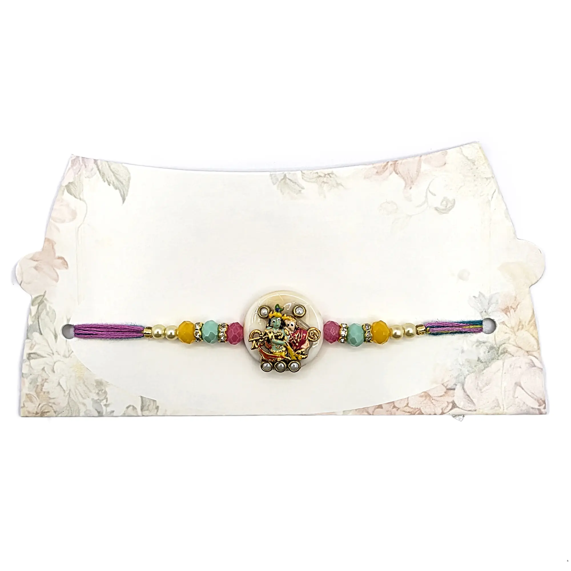 Celebrate the bond of siblinghood with this exquisite, handcrafted Krishna Rakhi. This Rakhi features a unique design with a central, round pendant depicting the beloved deities, Radha and Krishna. The pendant is delicately adorned with pearl-like accents for an added touch of elegance.