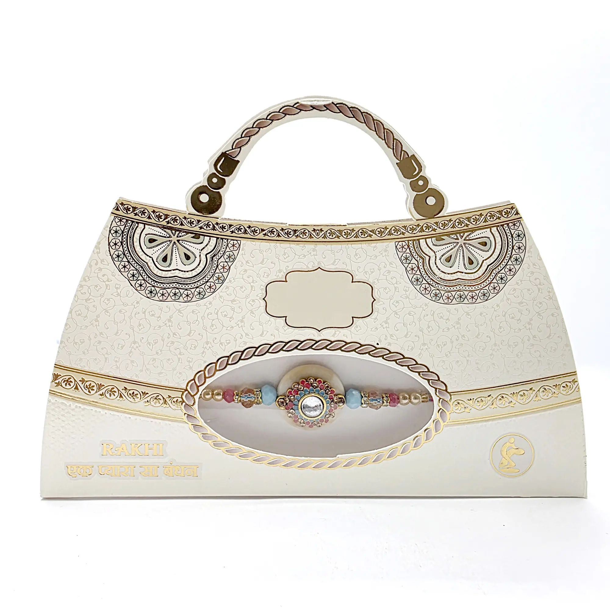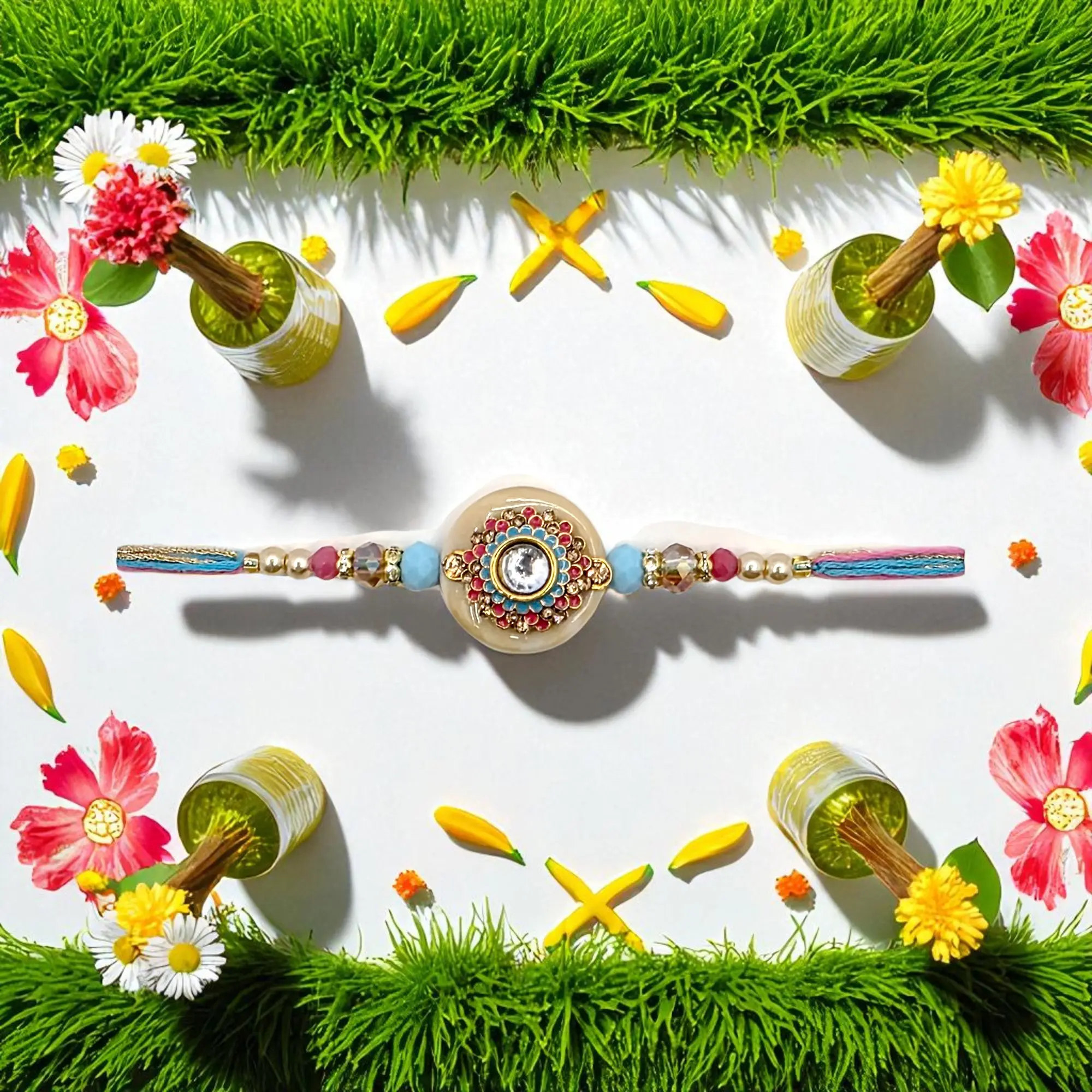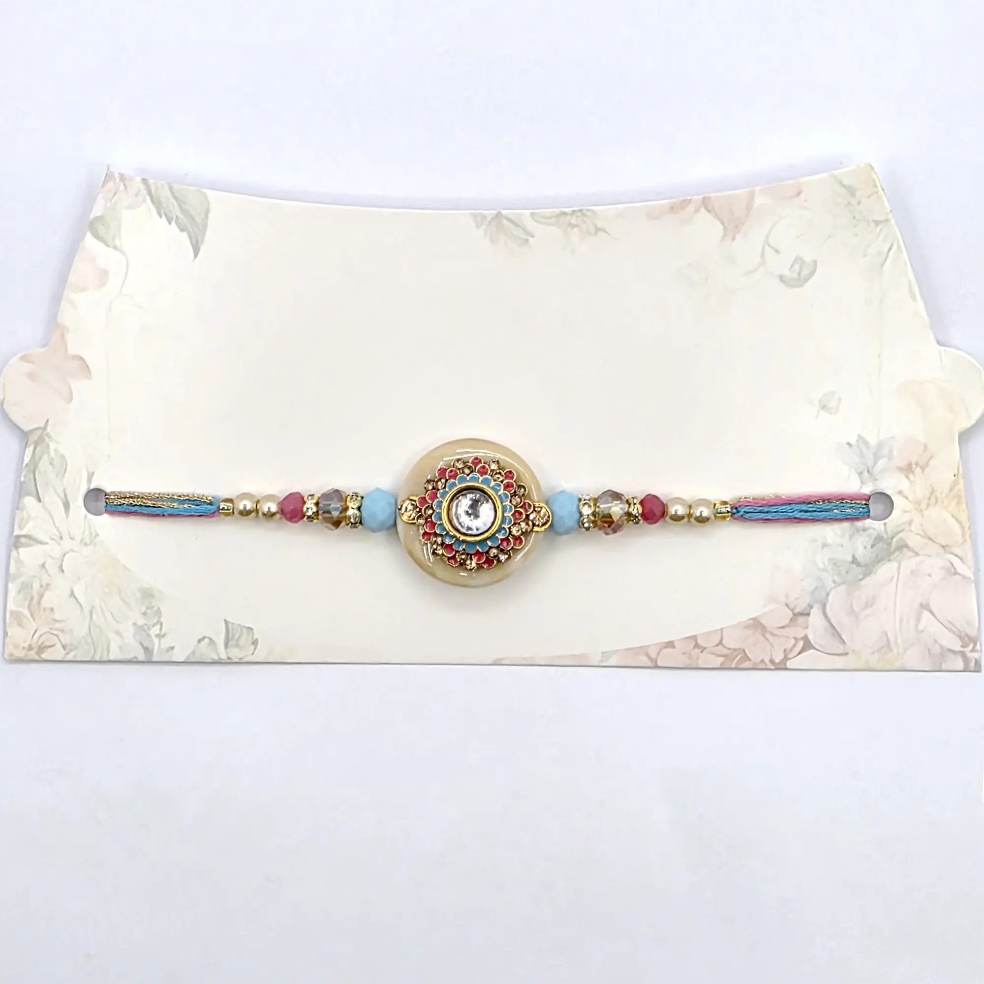 Celebrate Raksha Bandhan with this beautifully artistic Rakhi. The centerpiece showcases a detailed design reminiscent of a blooming flower, centered with a glistening stone. Its sides are embellished with an elegant mix of fuchsia, sky blue, and golden beads, finishing with coordinated blue and pink threads, making it a unique and festive adornment for your brother's wrist.