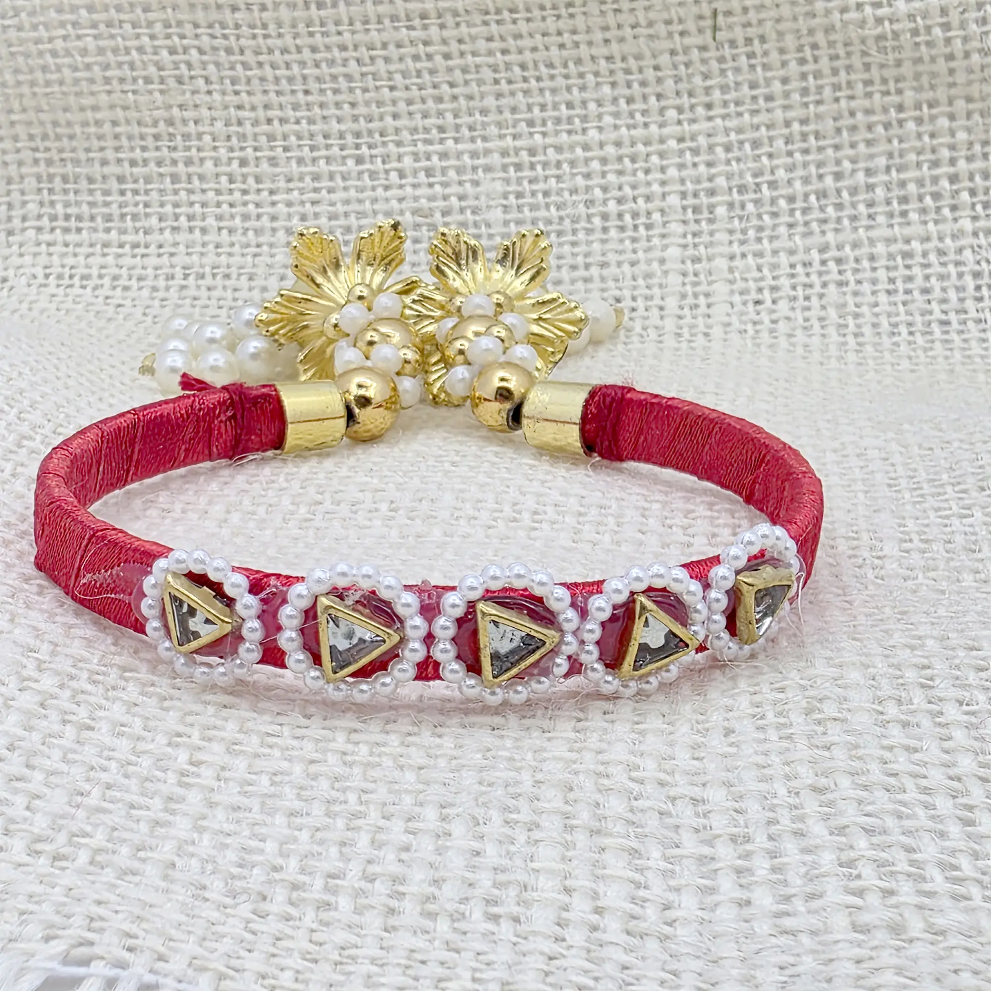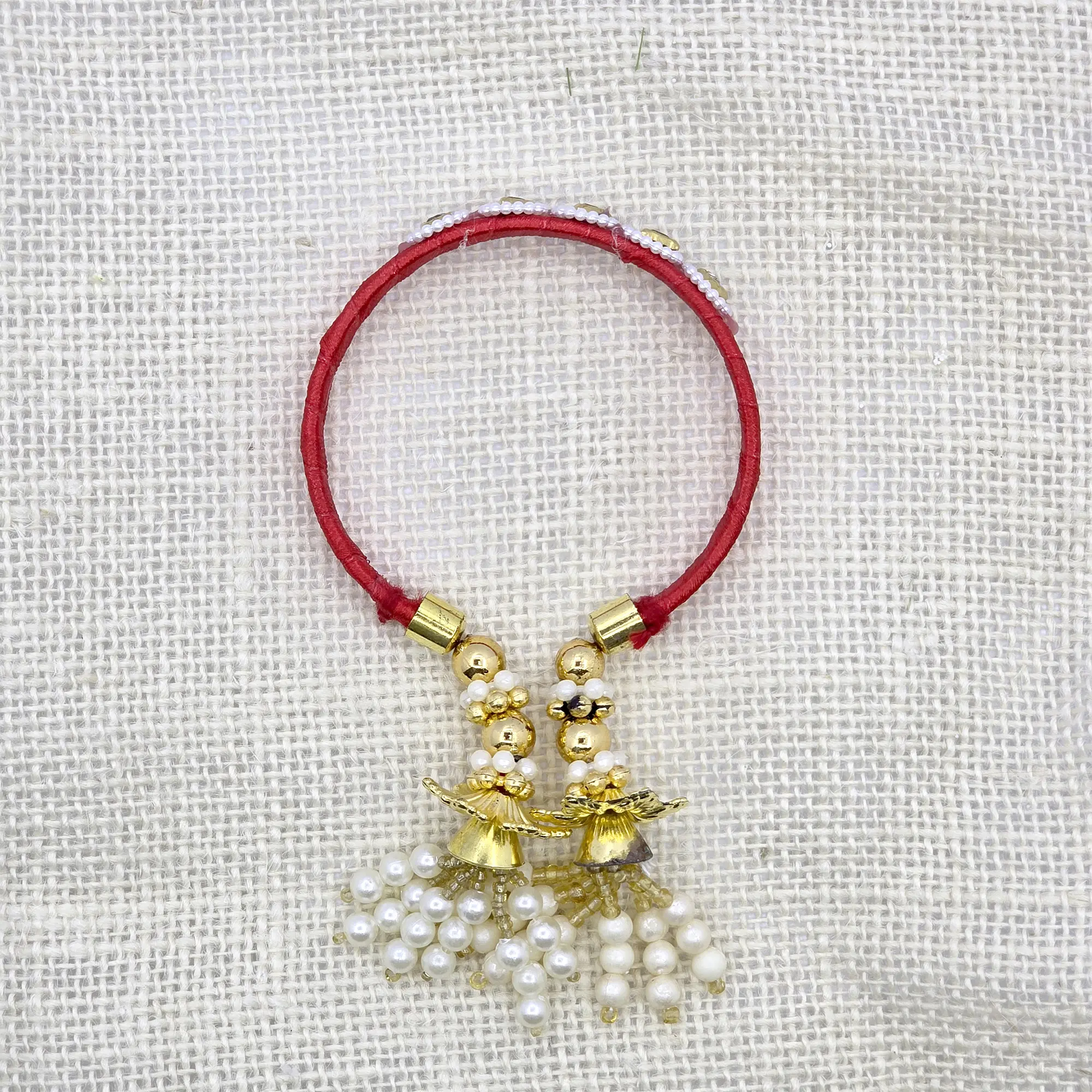 Celebrate the bond of love with this beautifully handcrafted rakhi. This traditional rakhi features a vibrant red thread circle adorned with delicate pearl and gold accents. The rakhi is finished with elegant pearl and gold bead tassels, adding a touch of sophistication to this symbolic piece. A perfect expression of your affection for your beloved brother.