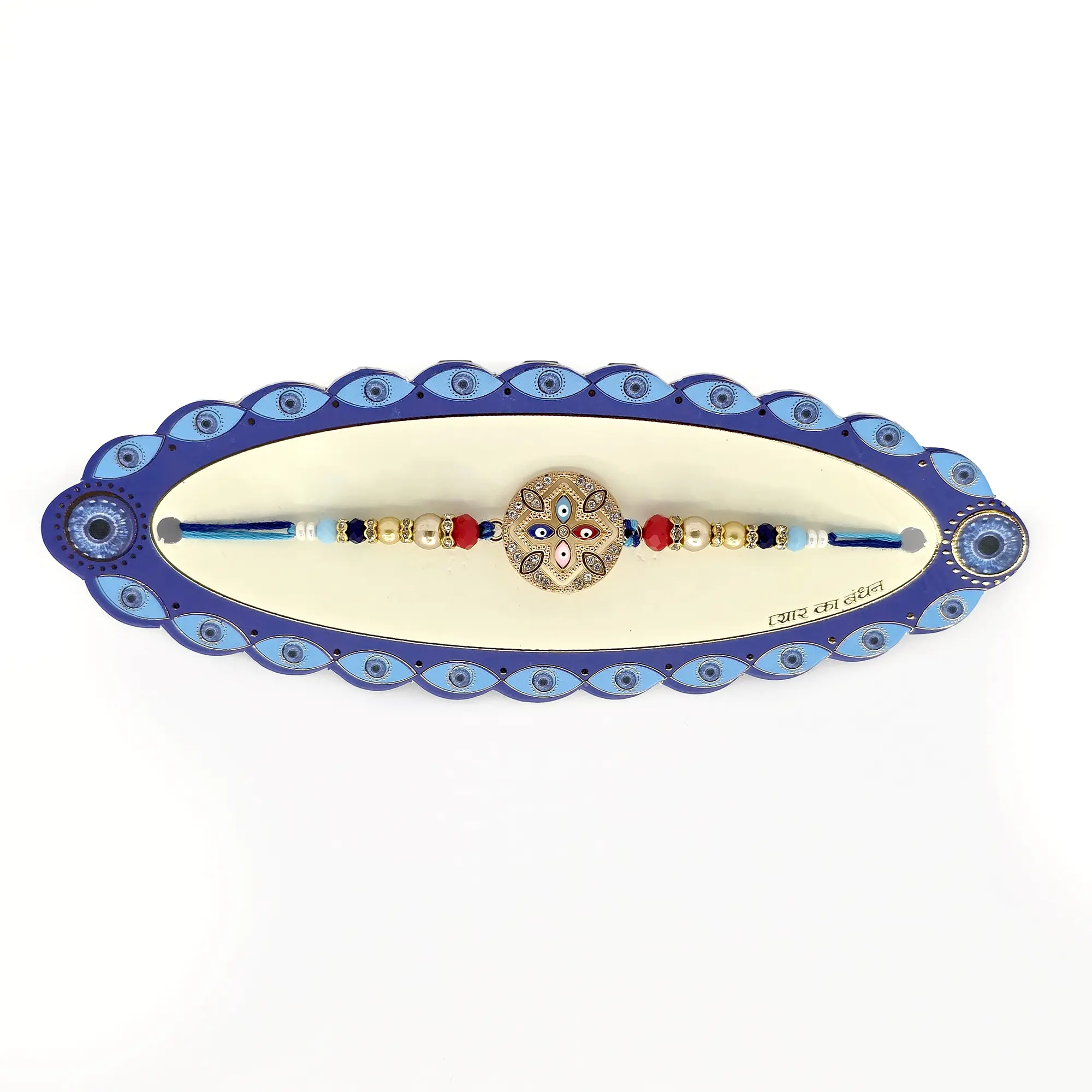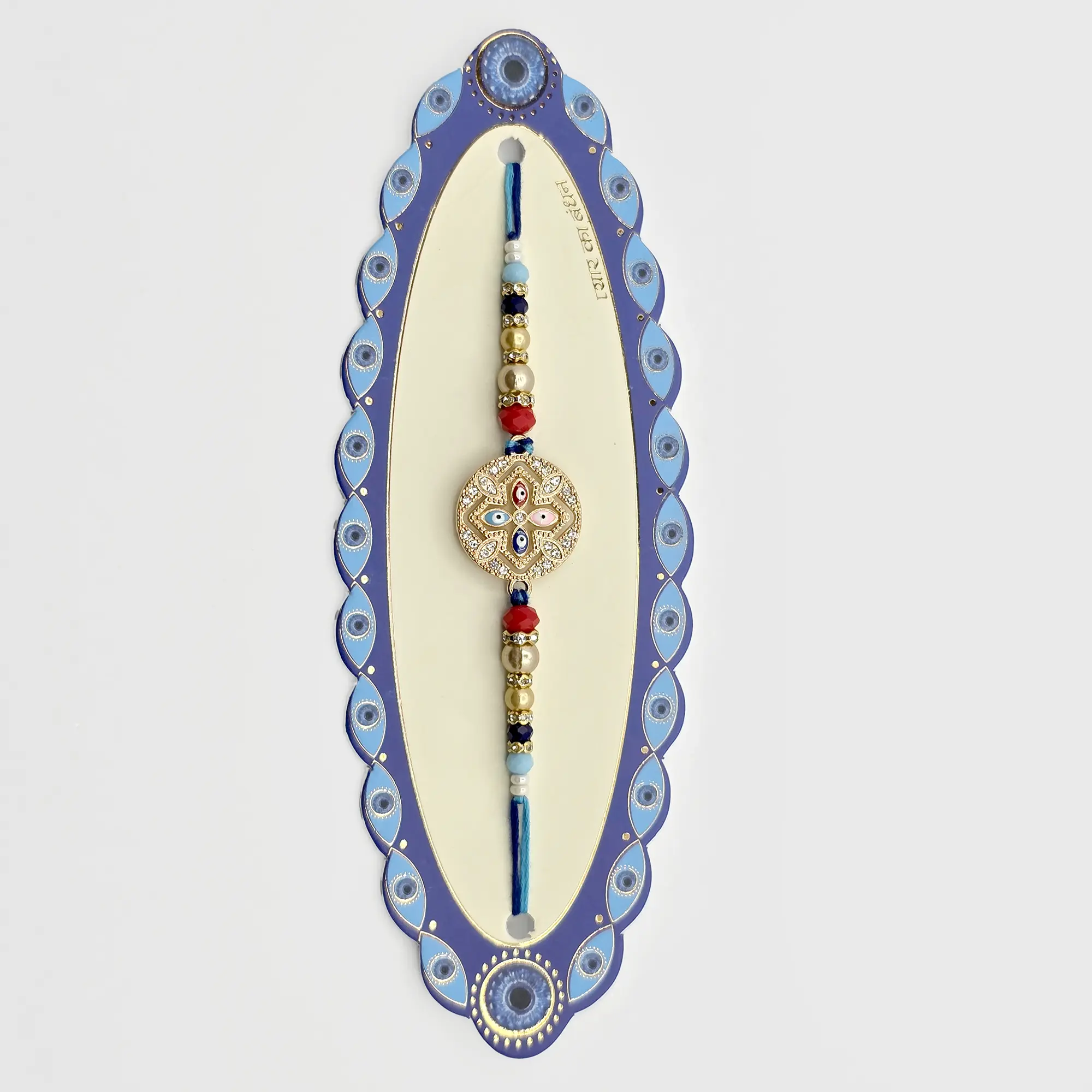 Celebrate the bond of siblinghood with this exquisitely designed Rakhi. Featuring a delicate centerpiece adorned with shimmering stones and a captivating evil eye motif, this Rakhi combines traditional sentiment with a touch of contemporary style.