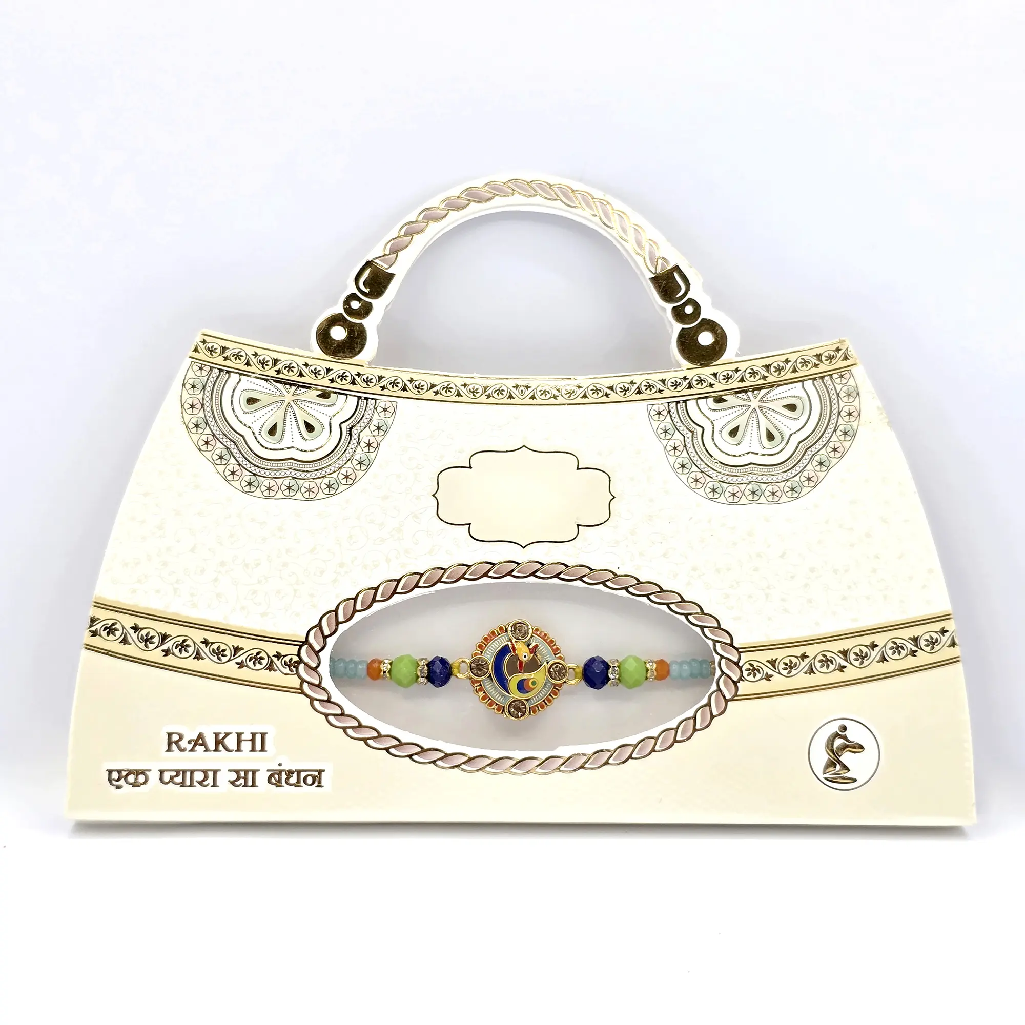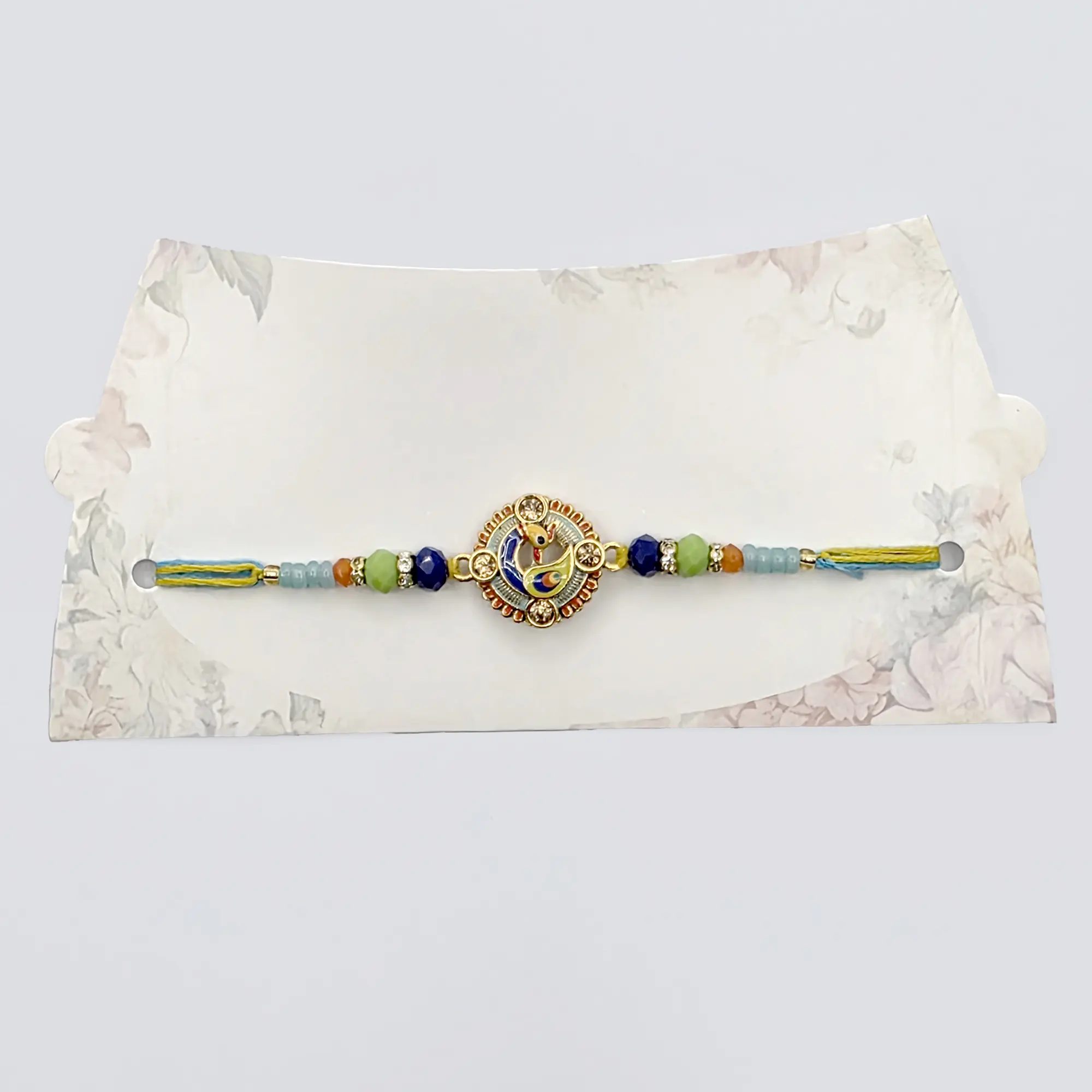The Rakhi is strung with a combination of vibrant beads in shades of blue, green, and orange, adding a touch of contemporary flair. The beads are carefully selected to complement the peacock design and create a harmonious overall look. The bracelet is adjustable to ensure a comfortable fit for any wrist size.