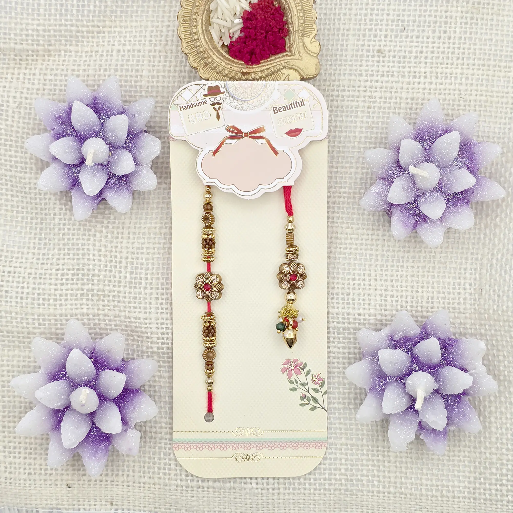 Elegant Design: The rakhis showcase intricate detailing with golden beads, sparkling stones, and a touch of traditional charm.