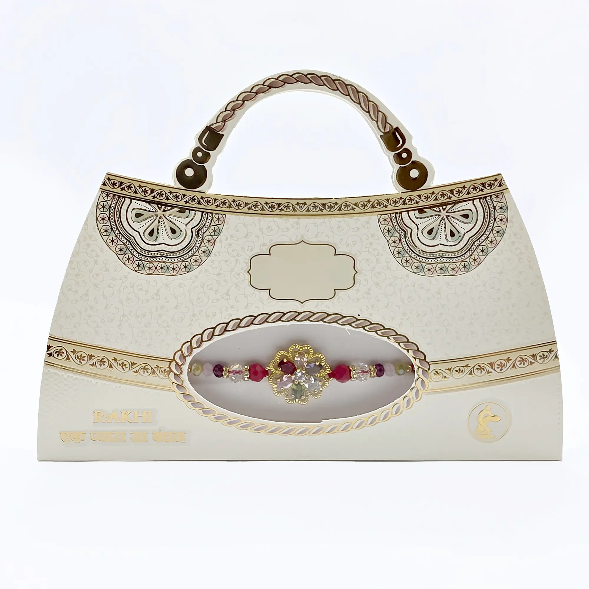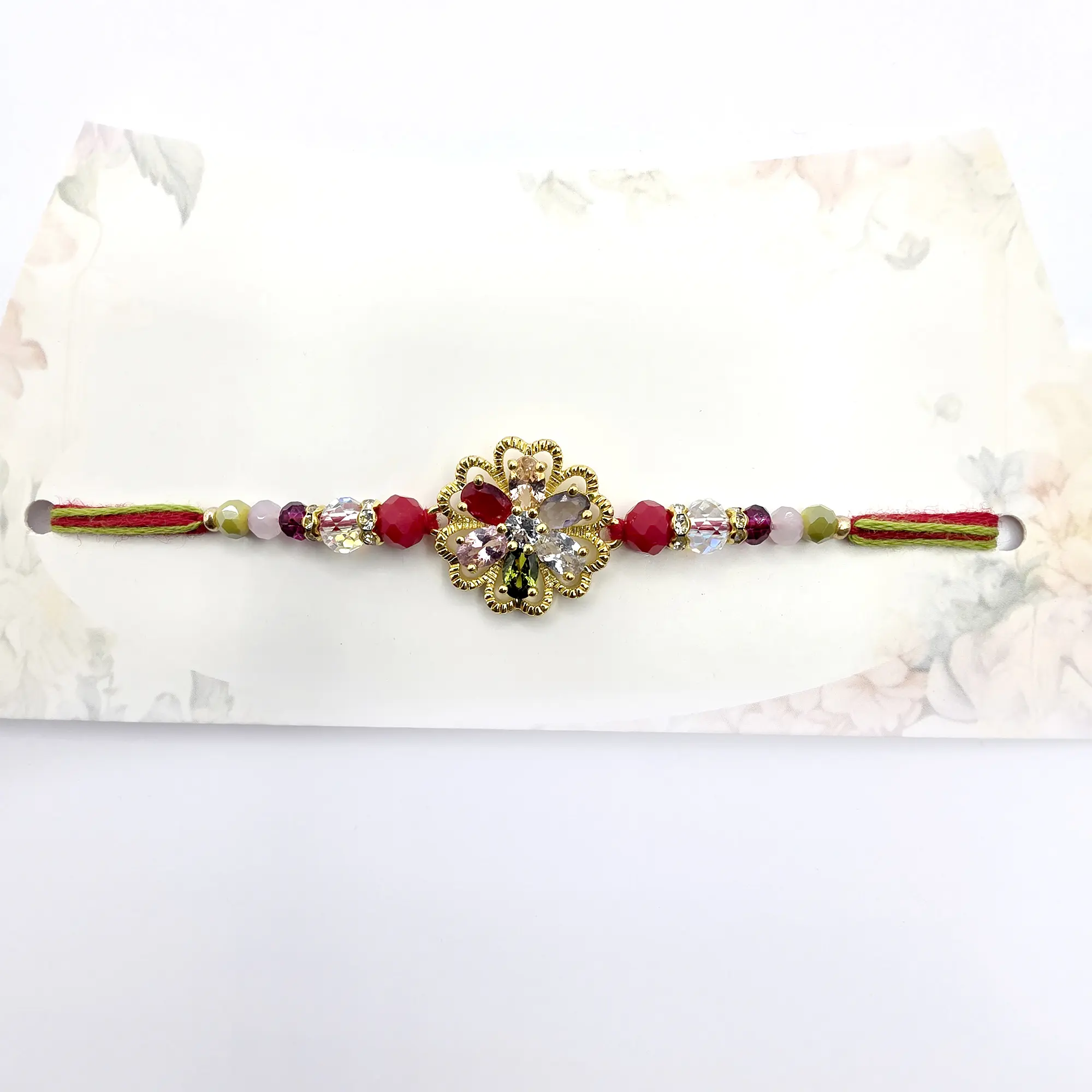 Celebrate Raksha Bandhan with this exquisitely designed and handcrafted gemstone flower Rakhi. This unique Rakhi features a dazzling floral centerpiece adorned with vibrant gemstones in shades of red, pink, green, and clear, all set within a delicate gold-tone framework.