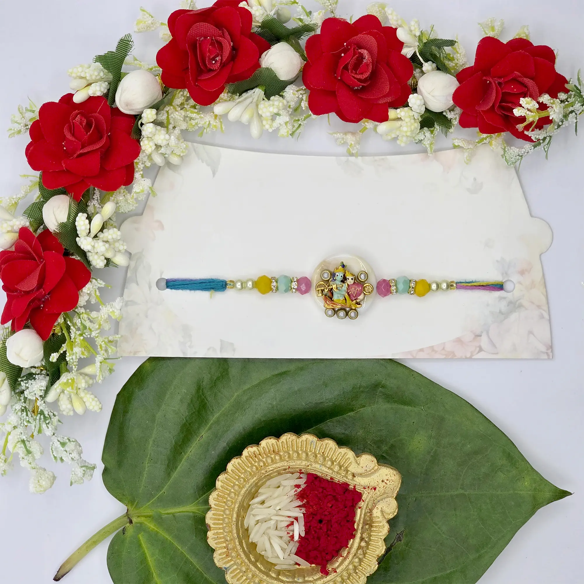 Celebrate the bond of siblinghood with this exquisite, handcrafted Krishna Rakhi. This Rakhi features a unique design with a central, round pendant depicting the beloved deities, Radha and Krishna. The pendant is delicately adorned with pearl-like accents for an added touch of elegance.