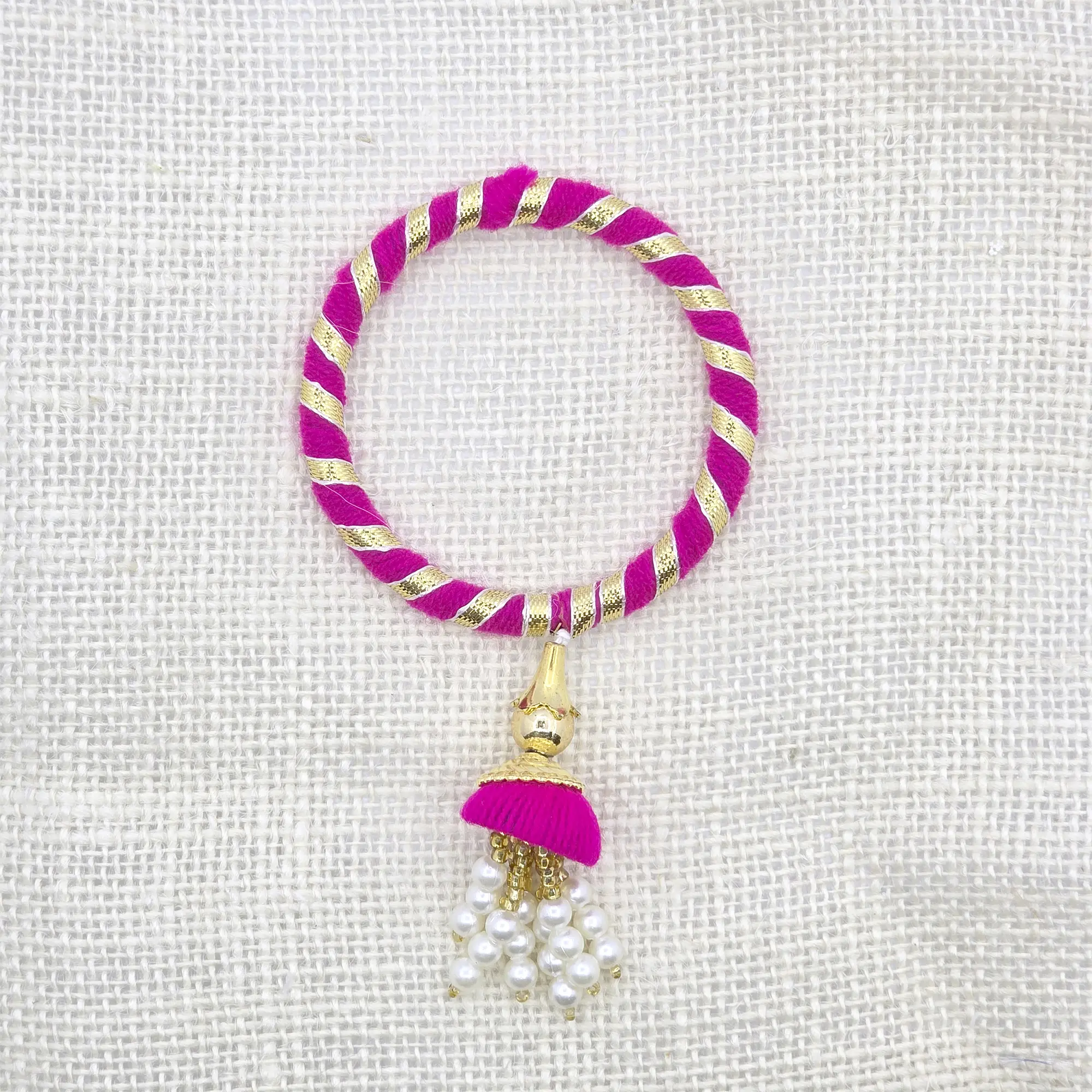 Celebrate the bond of love with this beautiful and unique handcrafted Rakhi. This Rakhi features a vibrant pink base intricately wrapped with shimmering gold thread, creating a stunning contrast. A decorative gold pendant and a playful tassel of pink fabric and delicate pearls add a touch of elegance.